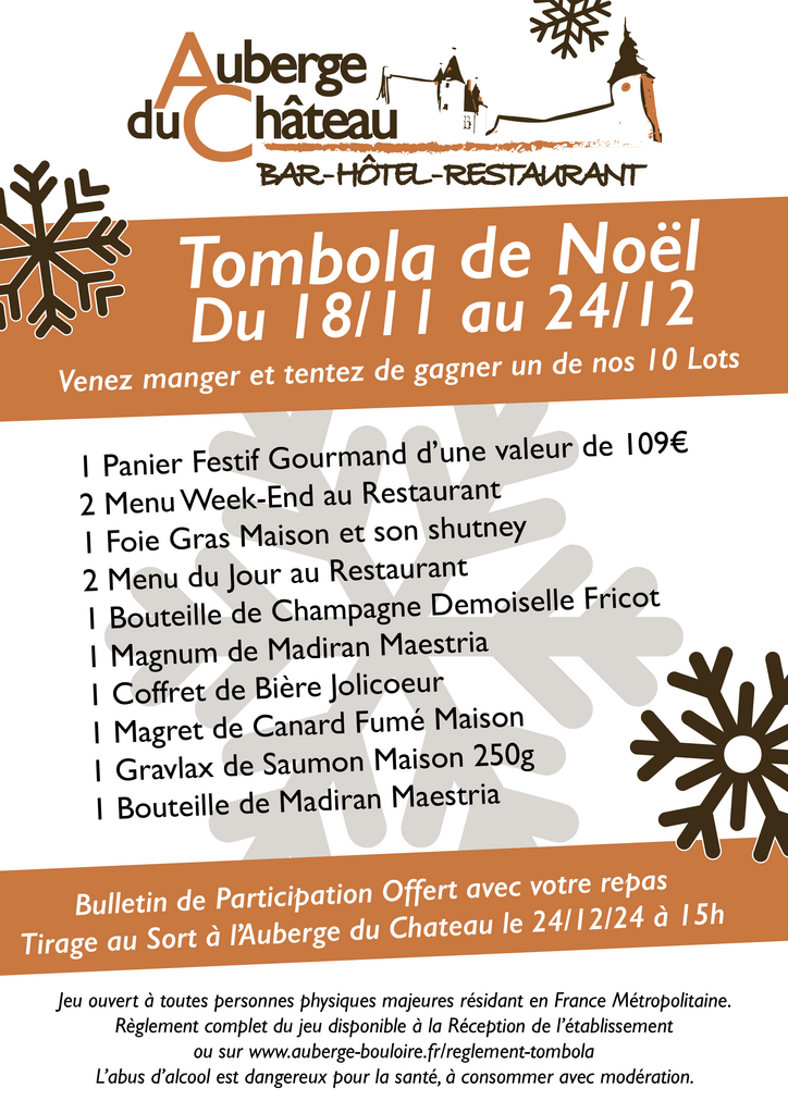 Règlement de la tombola de Noël organisée par l’Auberge du Chateau
